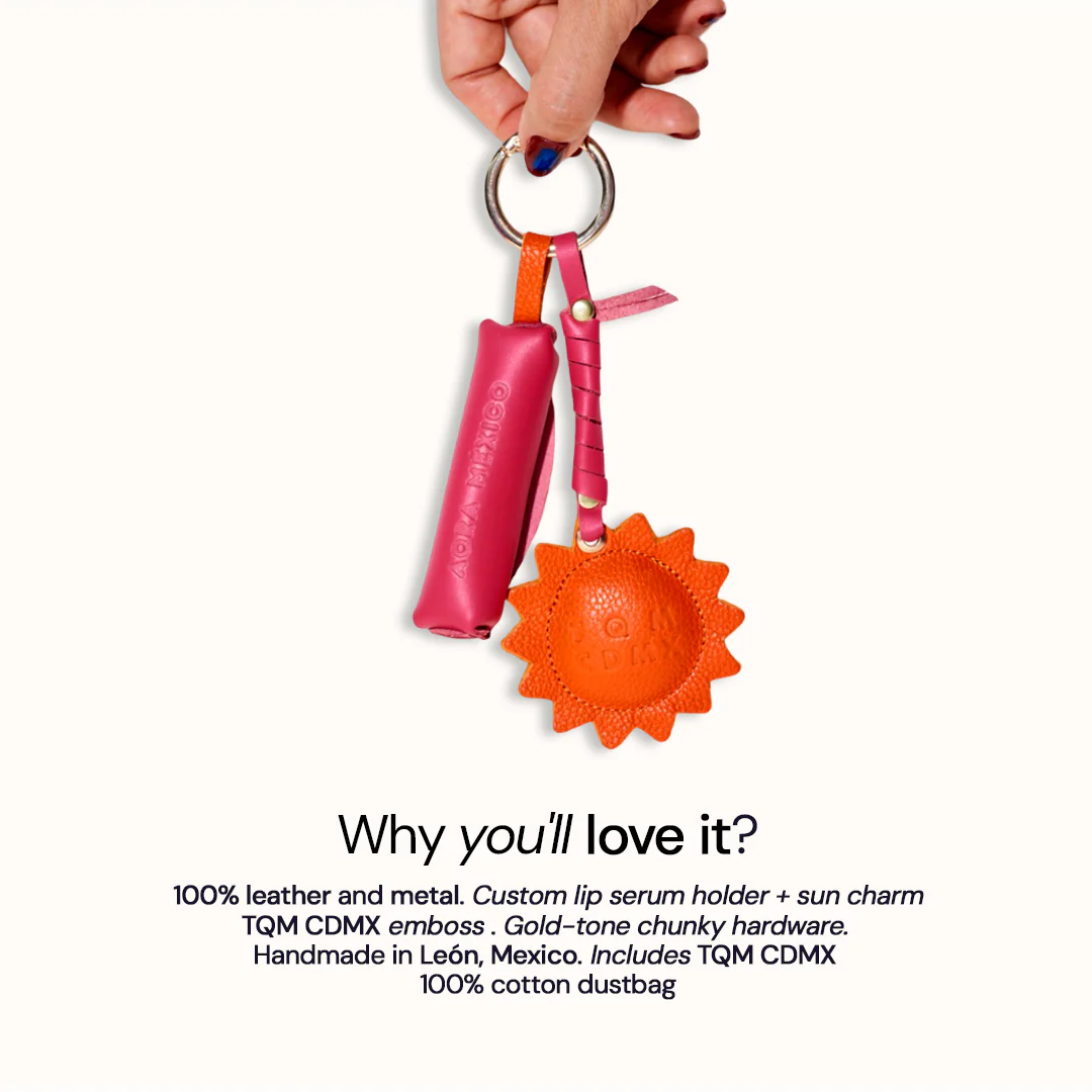 A little sunshine everywhere you go. This sunny bag charm is designed transport your Solid Lip Serum a todos lados, near and far. Features embossed TQM CDMX textâ a widely used text abbreviation for âte quiero muchoâ, like ILY in english. Handmade in Mexico.
